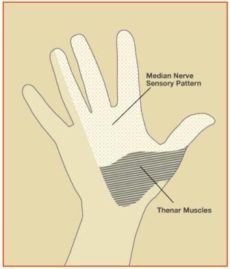 The symptoms of carpal tunnel syndrome often involve the area that is innervated by the median nerve. This area involes the thumb and typically the next two or three fingers. There is a lot of variability in symptoms.